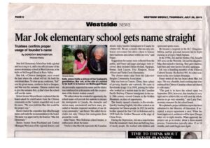 2014 – Mar Jok Elementary School opens in the Rose Valley Community. The school was named in honour and remembrance of Jok’s service, charity and benevolence to the Okanagan community.